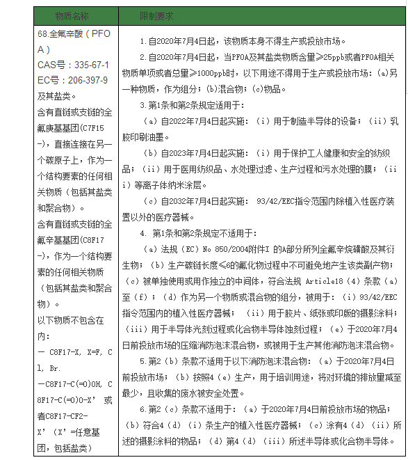 2017年6月14日,欧盟在其官方公报上发布(EU)2017/1000,新增REACH法规附件XVII第68项关于全氟辛酸(PFOA)的限制条款,正式将PFOA及其盐类和相关物质纳入REACH法规限制清单。法规将于官方公报发布后第20天开始生效,适用于所有成员国。