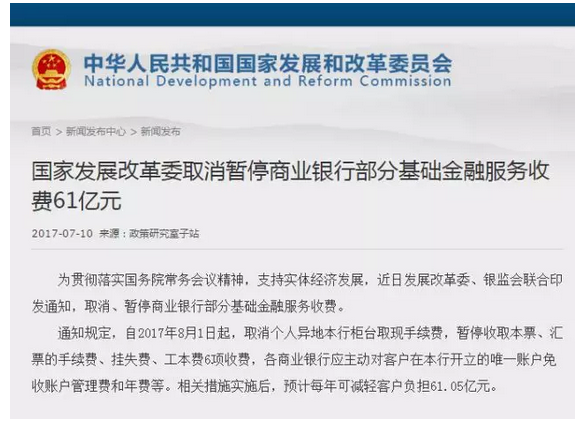 据国家发改委网站消息,近日发展改革委、银监会联合印发通知,取消、暂停商业银行部分基础金融服务收费。