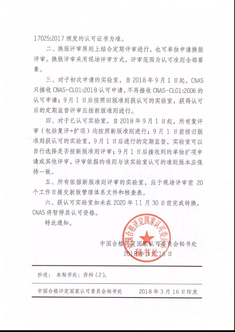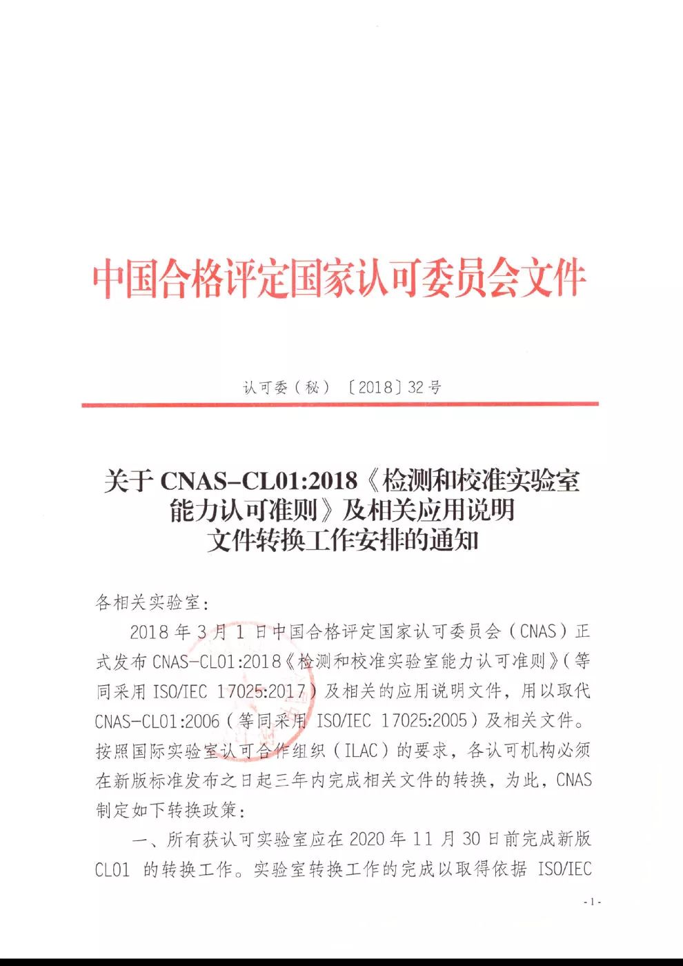近日,CNAS发布《关于CNAS-CL01:2018<检测和校准实验室能力认可准则>及相关应用说明文件转换工作安排的通知》,明确规定了CNAS-CL01:2018(即ISO/IEC 17025:2017)换版的截止日期,包括实验室新申请、复评CNAS资质认可的截止时间,详见通知全文。