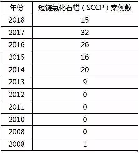 欧盟非食用危险产品快速预警系统(RAPEX)在2008~2018年期间共召回119例含短链氯化石蜡(SCCP)产品,涉及玩具,人造革的手提包或钱包,运动垫,跳绳,塑料化妆箱,文具盒和智能手机壳等,近几年的案例数目统计见下表,可以看出短链氯化石蜡召回案例呈现逐年上升趋势,而2018年到目前为止仅九周就已经召回了15例,案例数接近2017年数量的的一半,由此可见欧盟加强了对短链氯化石蜡的市场监管。
