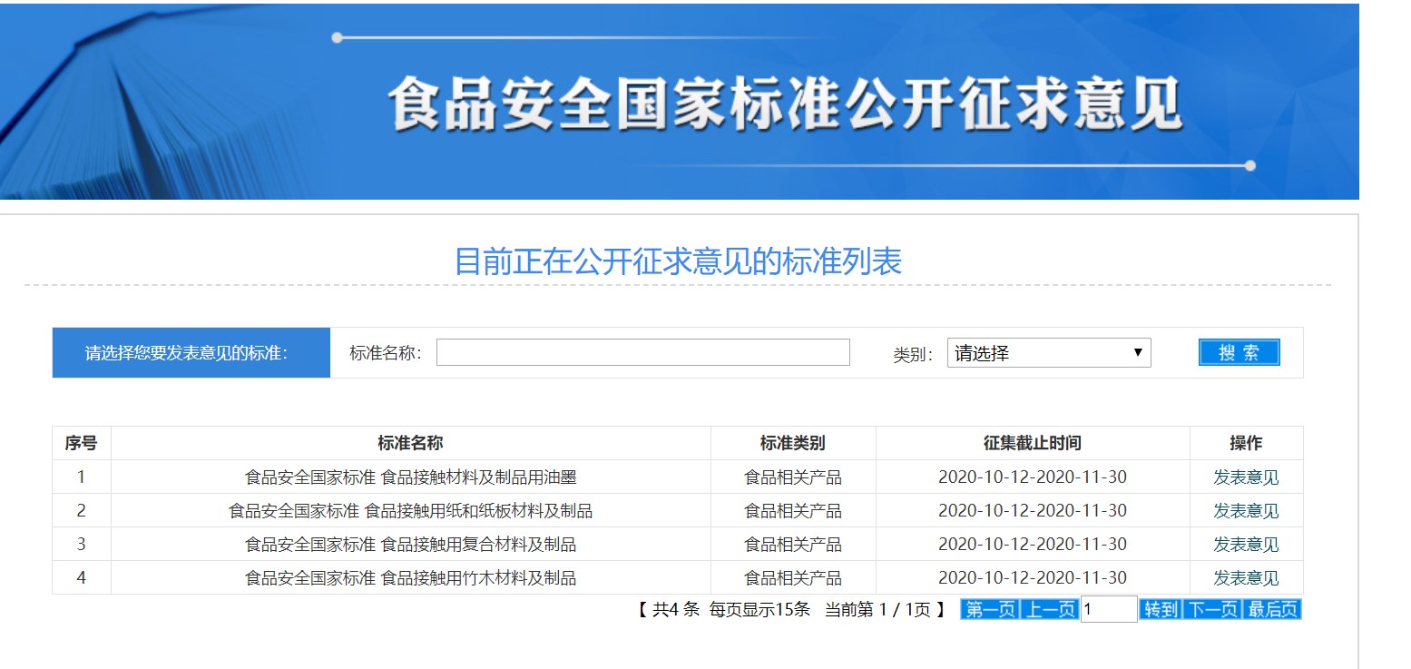 2020年10月15日,国家卫生健康委员会发布公告,就《食品安全国家标准 食品添加剂 胶基及其配料》等18项食品安全国家标准(征求意见稿),向社会公开征求意见,截止日期为2020年11月30日。其中包括以下四项食品接触材料产品安全标准,分别涉及食品接触材料及制品用油墨、食品接触用纸和纸板材料及制品、食品接触用复合材料及制品、食品接触用竹木材料及制品。